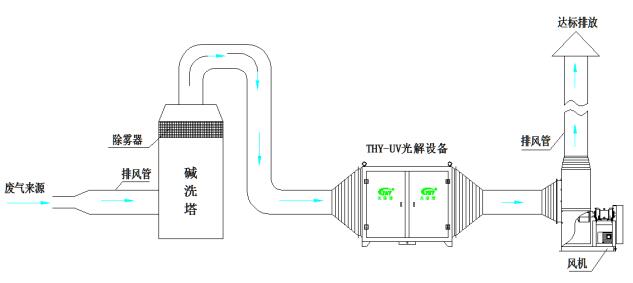 垃圾臭氣處理考慮運(yùn)營(yíng)成本及安全性,工藝采用以“通風(fēng)系統(tǒng)(管道、引風(fēng)機(jī))+核心凈化系統(tǒng)(噴淋塔+UV光解凈化設(shè)備)”為核心工藝來處理垃圾臭氣工藝設(shè)備圖如下: